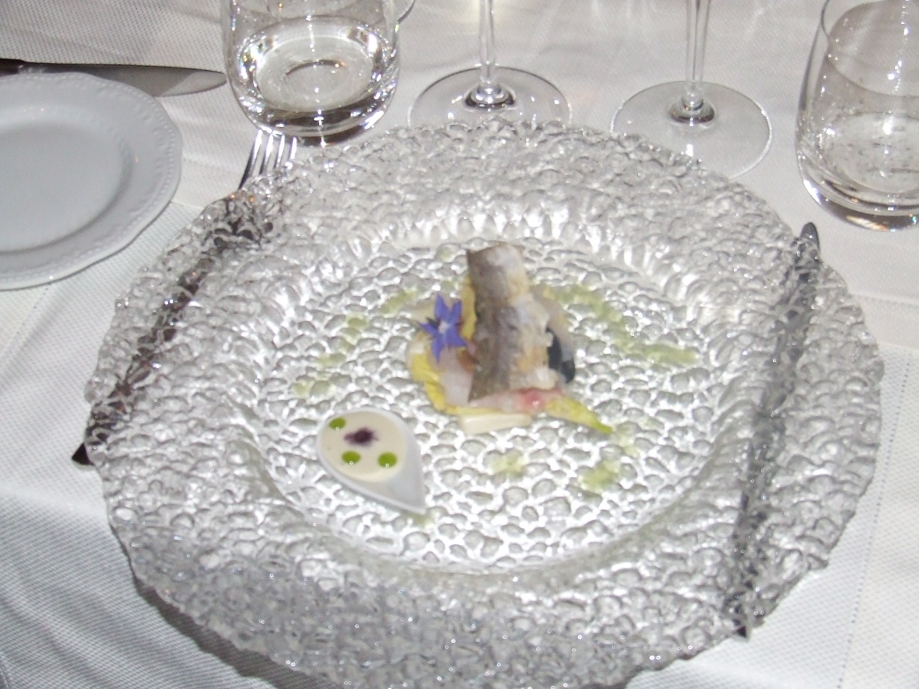 Primo antipasto. Insalatina di rinforzo a modo mio: merluzzo al sale di Mothia con crudité di scarola, cappero fiorito, pinzimonio di verdure in agro, alici di menaica su emulsione di senape. Che ci volete fare, bisogna rassegnarsi: un difetto ci deve pur essere in queste composizioni culinarie, meglio però se si riferisce soltanto al titolo troppo lungo, non vi pare? Infatti, il piatto, una sorta di joint venture tra il Cilento e la Sicilia, è sicuramente marinarescamente delizioso.