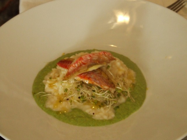 E arriviamo, così, ai primi piatti. Risotto carnaroli al pecorino di Moliterno con crudo di triglia allo zenzero fresco su salsa di broccolo nero e sentore di sfusato. A ridaglie… La lunga descrizione del piatto, comunque, nulla toglie alla gustosa e invitante elaborazione culinaria. Collusiva contaminazione tra mare e terra, con ingredienti dolci, amari, acidi e grassi che lottano tra di loro per arrivare alla perfetta fusione. Il risultato finale è incoraggiante. Anche se, mi pare, dalle parti della Costiera Sorrentina uno chef pluristellato ha pensato la stessa cosa. Sarà un caso? Boh!