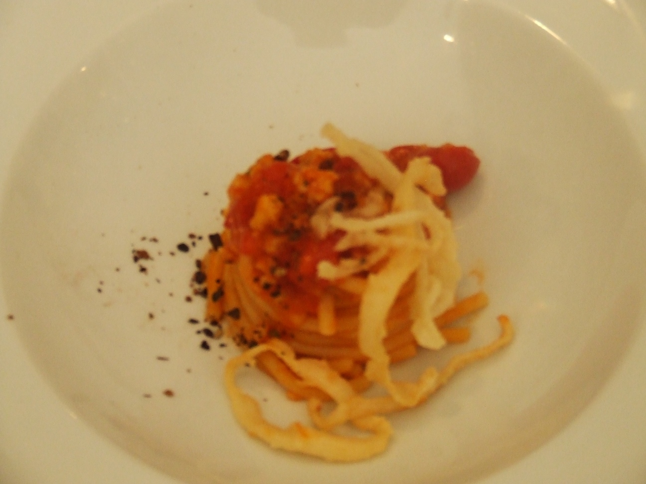 Tonnarelli in salsa di agrumi con ragù di totano e cipollotto IGT e croccante di pane agliato. Cottura perfettamente al dente della pasta, insaporita da ingredienti gradevoli. Ci può stare.
