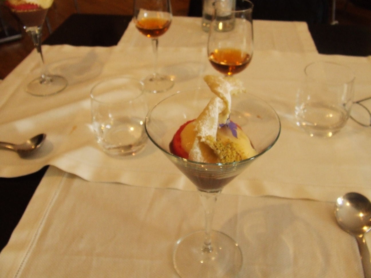Per finire due dolci: Savarin alla mela annurca con salsa inglese al sentore di limone e poi Coppa martini con salsa al cioccolato, biscotto all’alchermes, spuma alla vaniglia, fiore di borragine e cialda croccante. Obiettivamente ho apprezzato di più il primo, che ho trovato semplicemente favoloso.