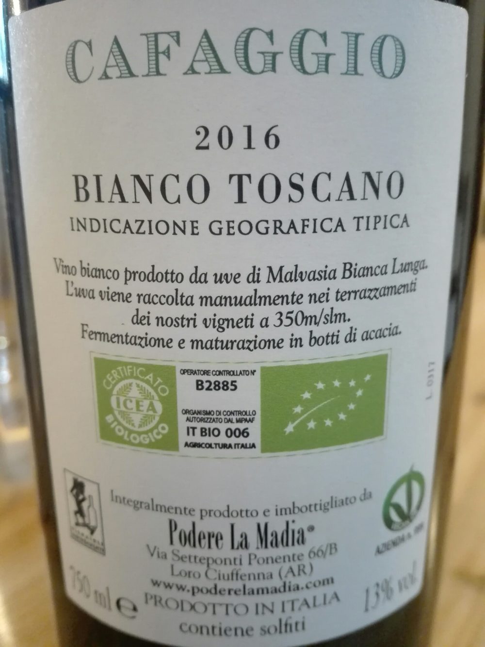 Un migliaio di bottiglie bio da uve di Malvasia bianca lunga ritrovata in una vigna terrazzata del 1945 e ripropagate in loco, ovvero in Valdarno. Botti di acacia, poi acciaio. Un naso cangiantissimo su cui misurarsi e discettare per ore. Una bocca asciutta, verticale, ma piena di cascami. Da provare.