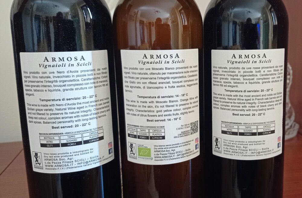 Sempre più viticoltori negli ultimi anni si sono convertiti ad una produzione di “vini naturali”. Anche Michele Moelgg, socio FIVI nonché chimico ed enologo trentino trapiantato ormai da venti anni a Scicli in Sicilia in provincia di Ragusa dove conduce con successo la sua minuscola azienda Armosa, si dedica alla produzione di simili vini. In questo fortunato lembo di terra, collocato alla fine della Sicilia e della stessa Italia, il vitigno principale è il Nero d’Avola e proprio con questa specie varietale il sig. Moelgg sforna tre eccellenti e pluripremiate etichette, di cui recentemente ho assaggiato le nuove annate.