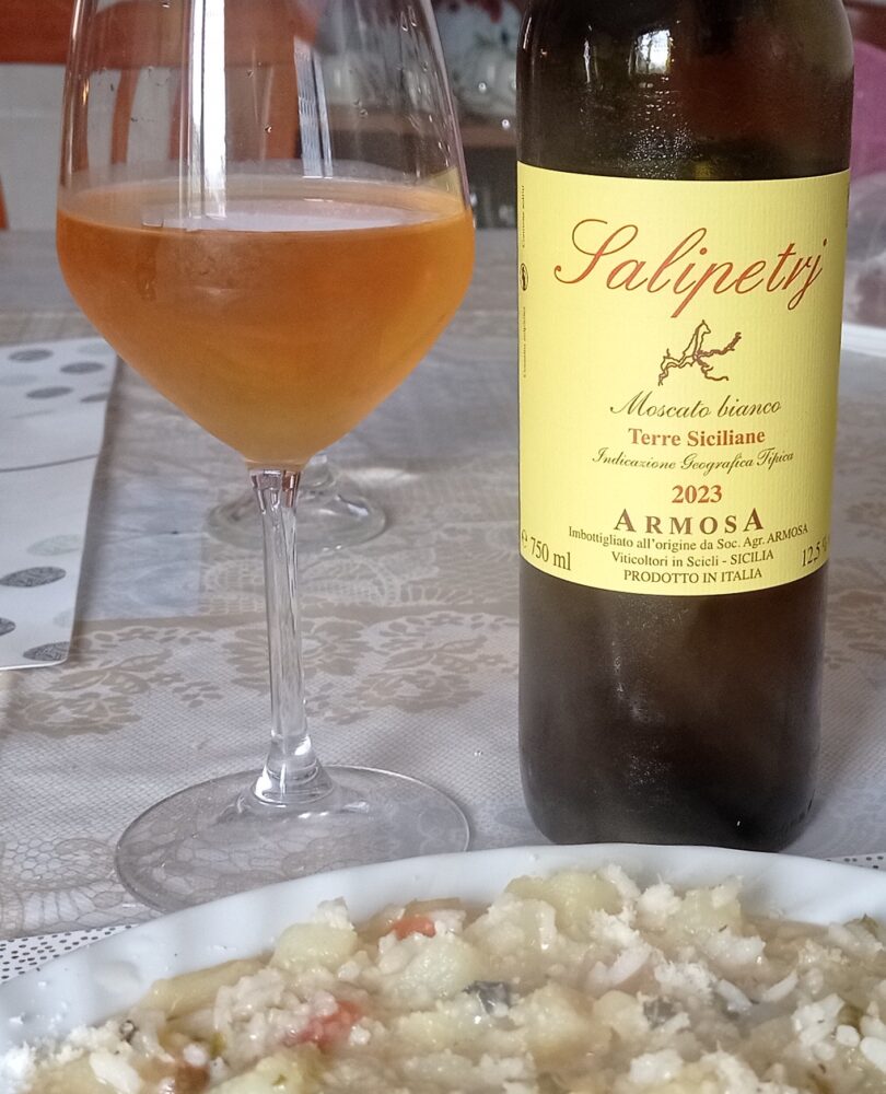 Salipetrj Moscato Bianco Terre Siciliane Igt 2023. Soltanto Moscato bianco fermentato in acciaio con macerazione sulle bucce per alcuni giorni. Maturazione sempre in acciaio per sei mesi e poi affinamento in vetro per circa quattro mesi. Gradazione alcolica di dodici gradi e mezzo. Prezzo finale di 20,00 euro.