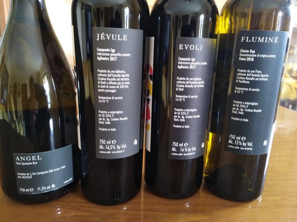 Quattro le etichette proposte (un bianco, due rossi ed uno spumate), frutto dell’allevamento dei canonici vitigni Aglianico e Fiano, le cui barbatelle sono state impiantate nel 2012. I vini sono curati dal mago della viticoltura cilentana Bruno De Conciliis, una garanzia in questo campo.