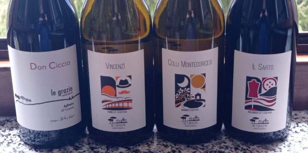 Le Grazie si estende su circa ventotto ettari, con tre ettari vitati. Nei filari convivono varietà autoctone e internazionali: 6.000 piante di Fiano, 600 di Falanghina, 2.600 di Aglianico, 600 di Angiolina, 600 di Piedirosso e 1.000 di Sirah. L’Angiolina merita una menzione a parte: è un’antica vigna locale ancora poco conosciuta, oggetto di studi all’Università di Portici per definirne l’origine genetica; da queste piante nasce un vino che racconta l’enigma e la ricchezza del territorio.