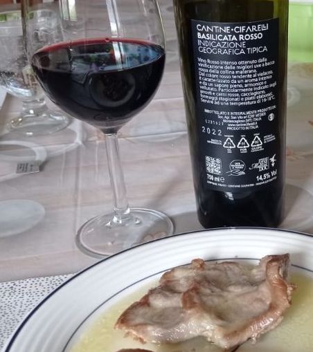 Rosso di San Vito Basilicata Igt 2022. Solo Aglianico. Affinamento per un anno in acciaio e due anni in bottiglia. Gradazione alcolica di quattordici e mezzo. Prezzo finale di 12,00 euro.