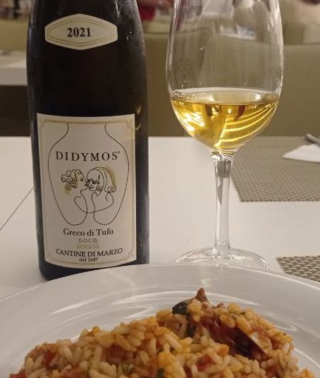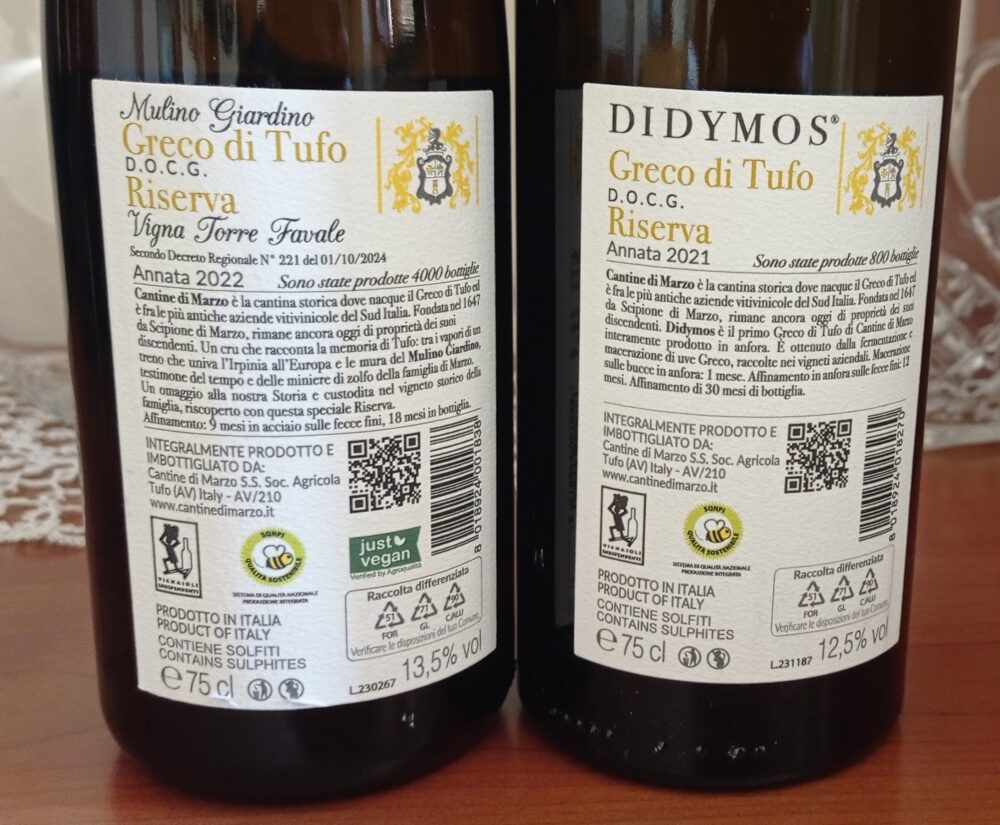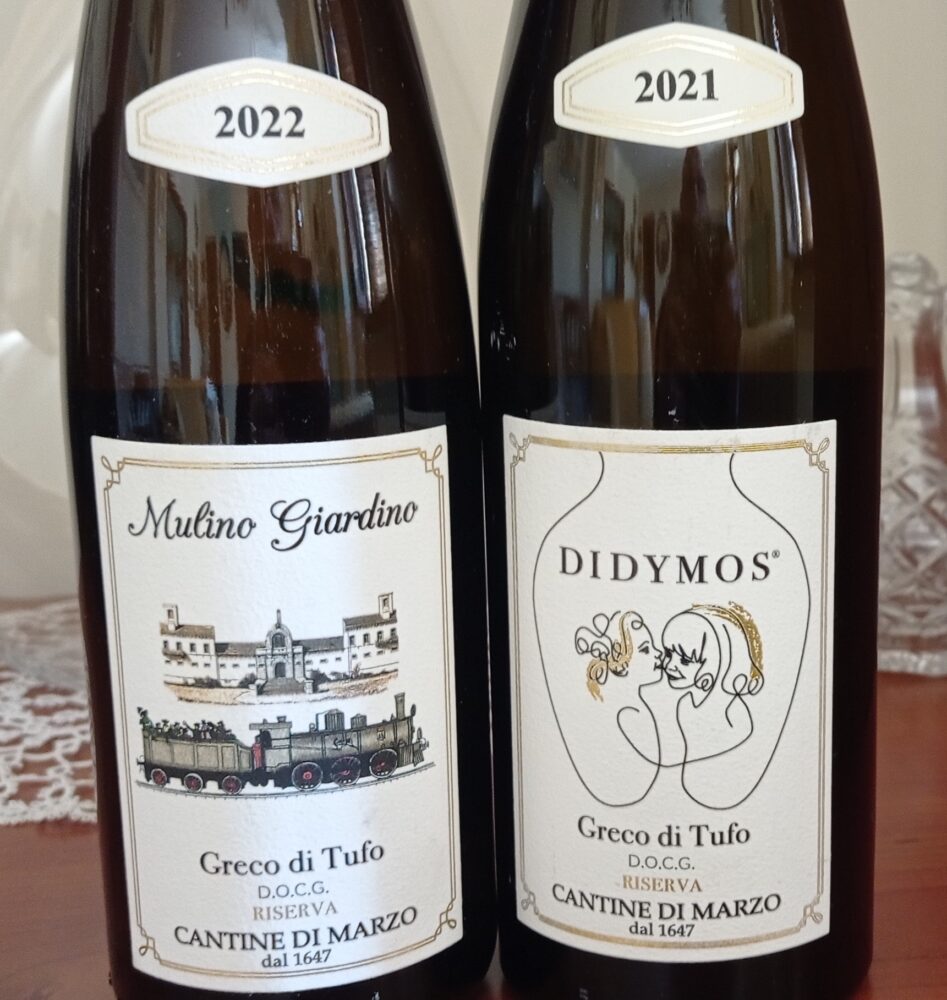 Didymos Greco di Tufo Riserva Docg 2021. Greco al 100% le cui uve sono state raccolte a metà ottobre. Fermentazione in anfora. Affinamento sulle fecce fini sempre in anfora per un anno. Elevazione in boccia per trenta mesi. Gradazione alcolica di dodici e mezzo. Prezzo finale di 30,00 euro. Appena 800 bottiglie prodotte.