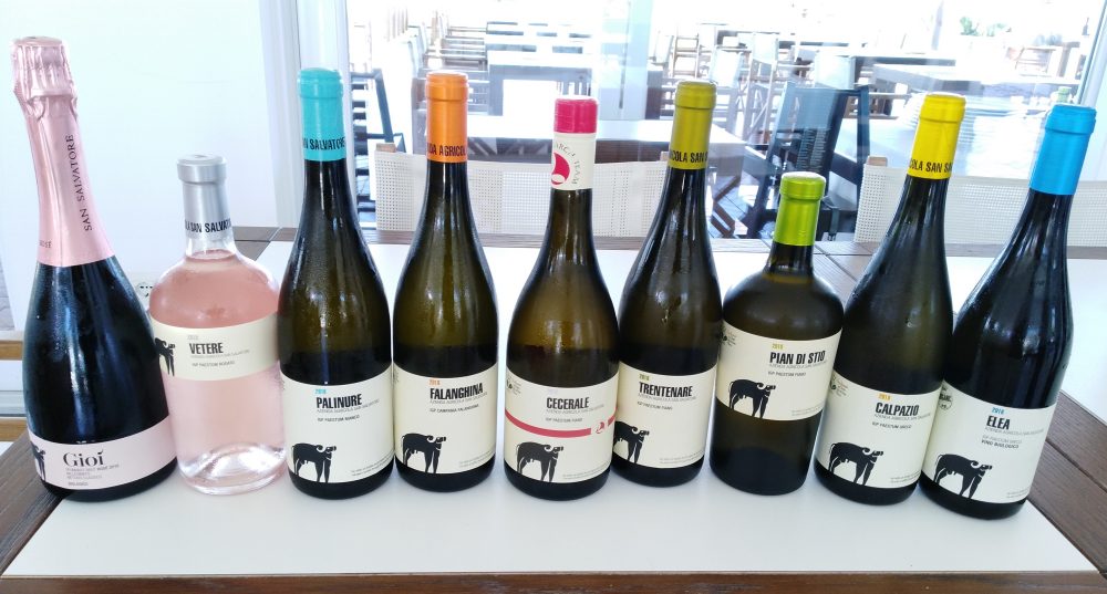 Palinure (non Palinuro, perché Peppino per evitare polemiche ha dovuto cambiare il nome alla bottiglia com’è successo con lo spumante Joì diventato Gioì) Paestum Igp 2018. Inedito tris in composizione di varietà bianche campane: Fiano, Greco e Falanghina. Unico blend aziendale, perché tutte le altre etichette sono prodotte con monovitigno. Acciaio e vetro. Tenore alcolico di tredici gradi. Prezzo finale di 12,00 euro.