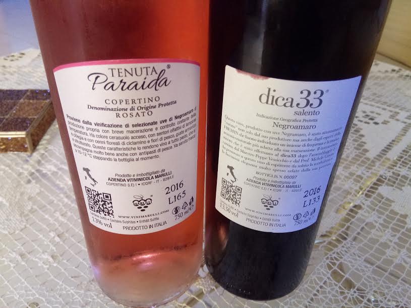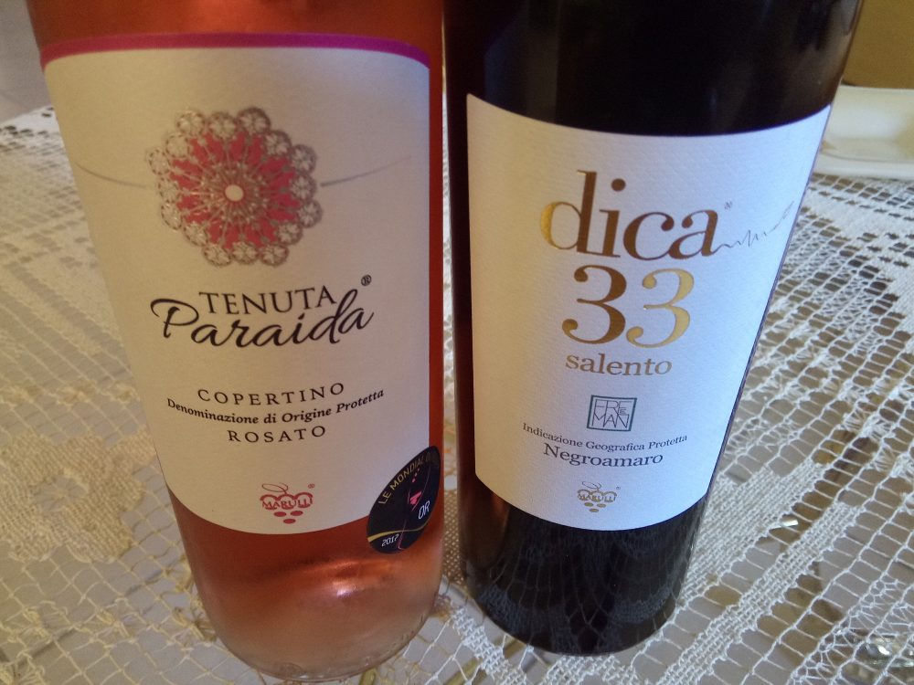 Cominciamo con il Tenuta Paraida Copertino Rosato Dop 2016. Negroamaro in purezza. Contatto con le bucce per 6-7 ore. Maturazione in vasche d’acciaio per tre mesi e poi elevazione in vetro. Tasso alcolico di tredici gradi. Prezzo finale della bottiglia intorno ai 10,00 euro.