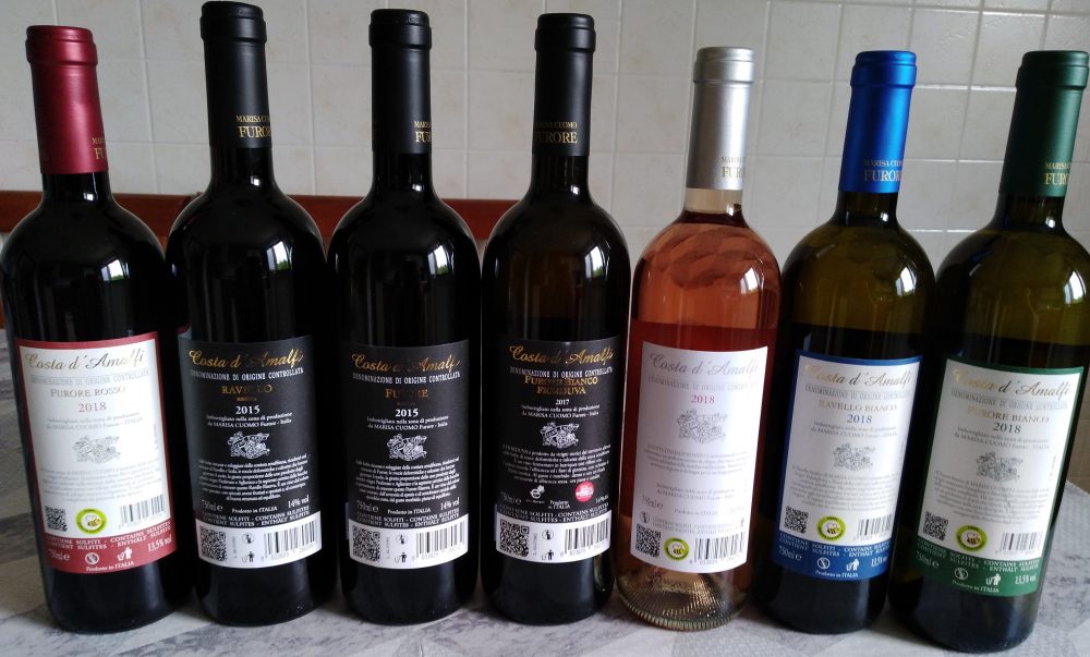Costa d’Amalfi Furore Rosso Doc 2018. Assemblaggio di Aglianico e Piedirosso fifty-fifty. Maturazione in acciaio, barriques di secondo passaggio per sei mesi e vetro. Gradazione alcolica di tredici e mezzo. Prezzo in enoteca di 15,00 euro.