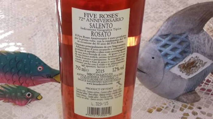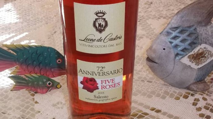 Partiamo dal famoso rosé Five Roses con l’ultimo millesimo in commercio, cioè il 2015. Si tratta di uno storico vino che ha indirizzato tutta la produzione tipologica nazionale e soprattutto quella Meridionale, perché dopo il Chiaretto Moniga del 1896 di Pompeo Gherardo Molmenti, è stato uno dei primi rosati ad essere imbottigliato in Italia nel 1943 e che con la vendemmia del 1993 (al compimento del cinquantesimo anno dalla nascita) si fregia del titolo di “Anniversario”. Si racconta che il generale americano Charles Poletti, commissario per gli approvvigionamenti delle Forze Alleate in Italia, desiderasse un vino dal nome anglofono. In quel tempo alcuni vigneti aziendali di negroamaro si trovavano ubicati presso una contrada chiamata “Cinque Rose”di Salice Salentino ed allora fu spontaneo tradurre il vino Five Roses in Inglese. In quel periodo di belligeranza le vetrerie al Sud Italia non erano produttive e così il vino rosato fu messo nelle bottiglie di birra riciclate!