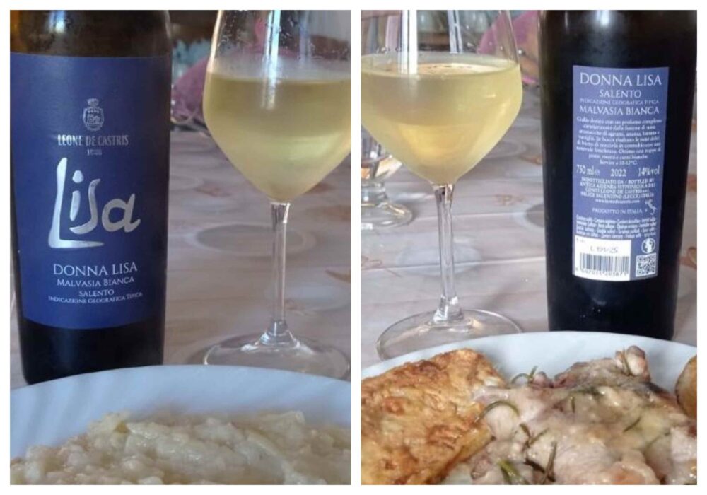 Donna Lisa Malvasia Bianca Salento Igt 2022. Soltanto Malvasia bianca vendemmiata alla metà di settembre. Maturazione in acciaio per sei mesi e poi affinamento in vetro per altri sei mesi. Tasso alcolico di quattordici gradi. Prezzo finale di 15,00 euro.