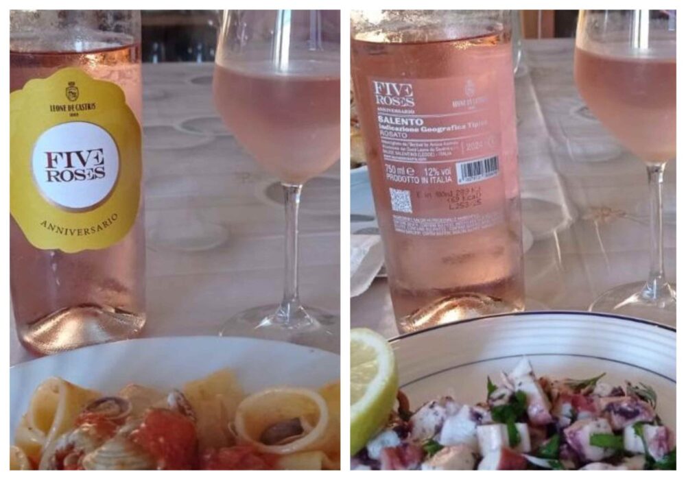 Spumante Salice Salentino Five Roses Brut Rosè. Soltanto Negroamaro vendemmiato a metà agosto del 2019 e sboccatura avvenuta nel 2022. Rifermentazione in bottiglia per due mesi e poi affinamento sui lieviti per trenta mesi. Gradazione alcolica di dodici e mezzo. Prezzo finale di 22,90 euro.