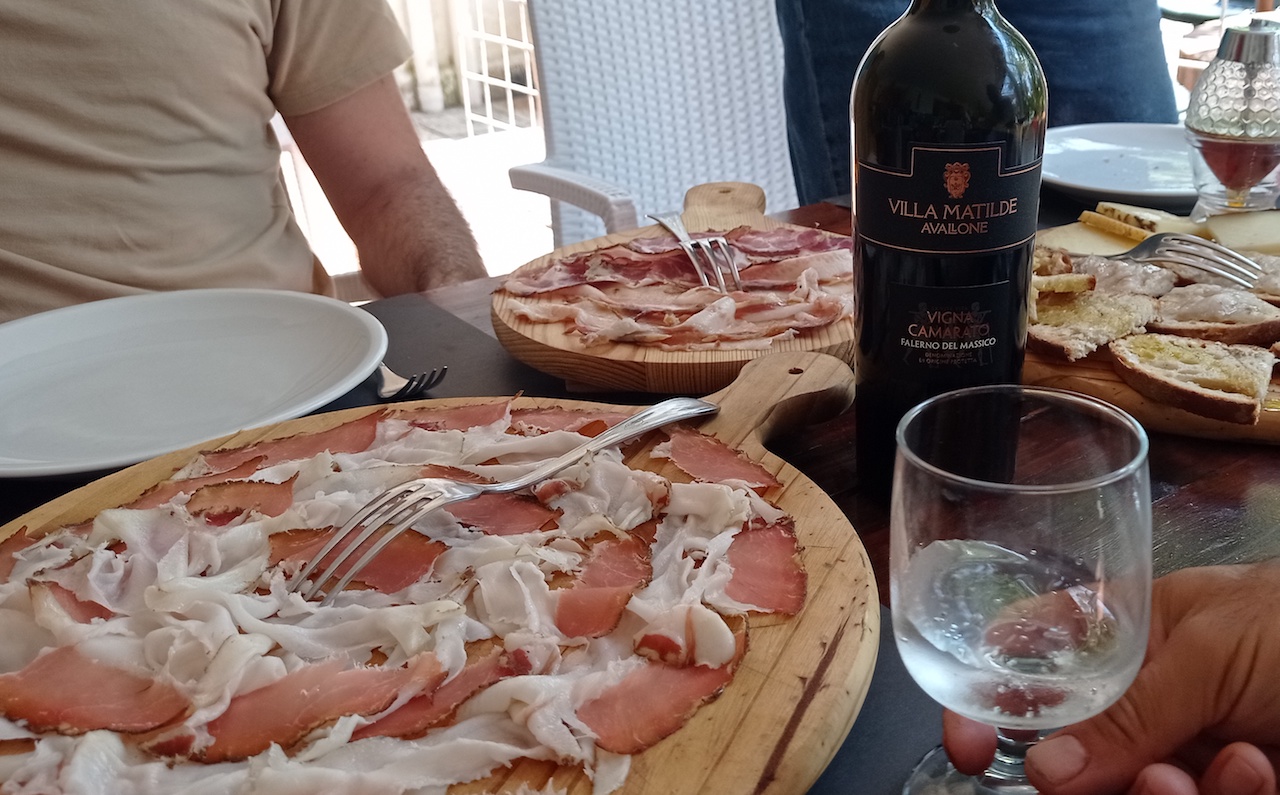Vigna Camarato Falerno del Massico Rosso Riserva Falerno Dop 2018. Aglianico all’80% e saldo di Piedirosso. Affinamento in barriques. Gradazione alcolica di quattordici e mezzo. Prezzo finale di 50,00 euro. Vino prodotto soltanto in annate favorevoli.