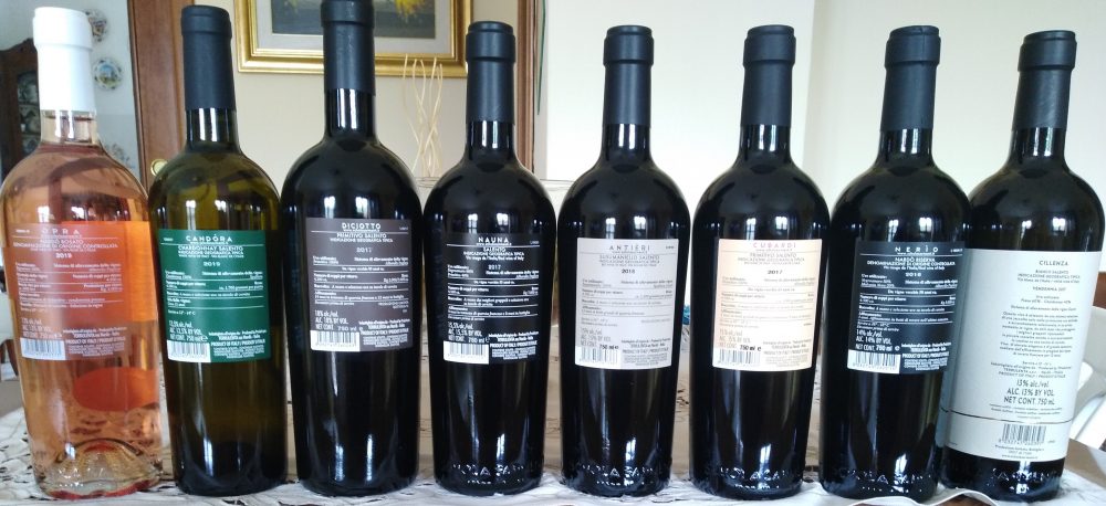 Per concludere alcune mie considerazioni finali. Si tratta sicuramente di un’eccellente batteria di vini. Non tragga in inganno l’eccessiva alcolicità dei rossi che può sembrare esagerata ma non è così, perché questa viene bilanciata da un’ottima acidità. D’altra parte bisogna ricordarsi che nel Salento coesistono tre elementi naturali che contribuiscono al benessere collettivo: il mare, il vento ed il sole. Quest’ultimo picchia forte nei mesi che vanno dalla tarda primavera alla fine dell’estate e, pertanto, le uve accumulano una notevole capacità di zuccheri, che poi naturalmente si tramutano in elevata alcolicità. Ma bisogna anche considerare che le varietà locali a bacca rossa Primitivo, Negroamaro, Malvasia Nera e Susumaniello sono portatrici di ottima acidità e detengono tannini affusolati, per cui il sorso è sempre morbido e gradevole tanto da non fare sentire l’elevata alcolicità.