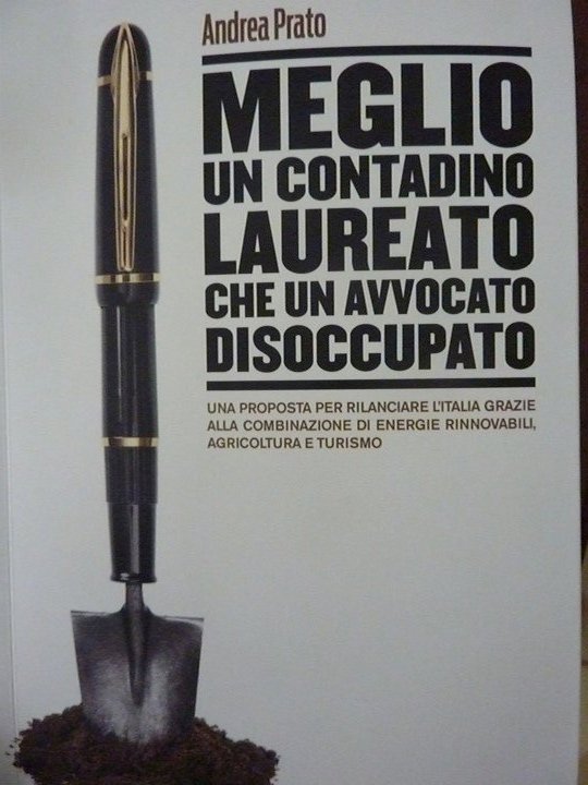 Nel libricino presentato al Salone, “Meglio un contadino laureato che un avvocato disoccupato”, che muove dalla rivalsa della campagna sull’industria e sulla crescente precarieta’ delle professioni, Andrea Prato, assessore all’Agricoltura della Regione Sardegna, affronta il tema in maniera molto interessante e completa. Dopo aver analizzato lo stato di crisi della agricoltura, “la peggiore dal dopoguerra ad oggi” che vede gli agricoltori, nonostante la pioggia di finanziamenti, abbandonare le terre e il territorio agricolo contrarsi (negli ultimi 40 anni, scrive l’autore, è scomparso quasi un terzo del territorio agricolo italiano, cioè ben cinque milioni di ettari), Prato propone la sua visione dell’economia italiana a partire dall’agricoltura mettendo in guardia gli agricoltori dall’inseguire chimere di facili guadagni ottenibili proprio dalla cessione o dal fitto di terreni a società per la produzioni di energia, che sia eolica o solare.