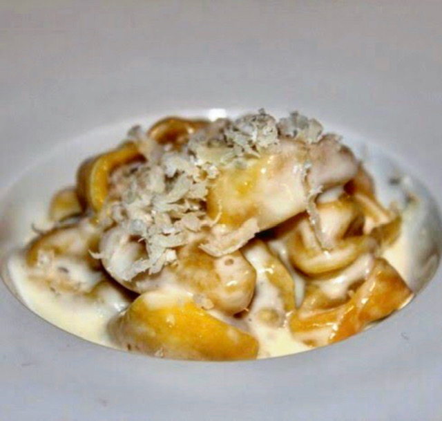 Enoteca Pinchiorri, Agnolotti di ossobuco stufato e ravioli di patata bianca, con sugo d’arrosto, fonduta di formaggio e tartufo bianco