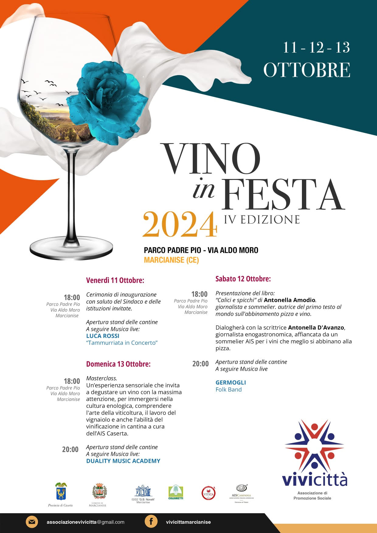Vino in Festa 2024, il programma 11/10/2024 Torna a: Vino in Festa 2024, a Marcianise dall’11 al 13 ottobre la tre giorni dei vini casertani Vino in Festa 2024, il programma← Precedente