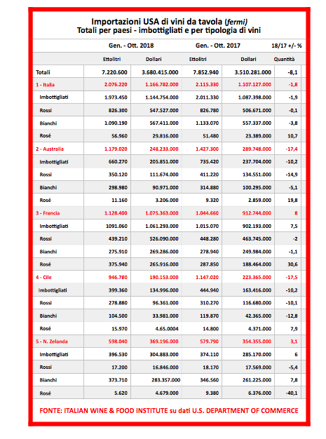 Sempre nei primi dieci mesi dell’anno le esportazioni italiane sono ammontate a 2.076.220 ettolitri, per un valore di $1.166.782.000, contro i 2.115.533 ettolitri dei primi nove mesi del 2017, per un valore di $ 1.107.127.000.