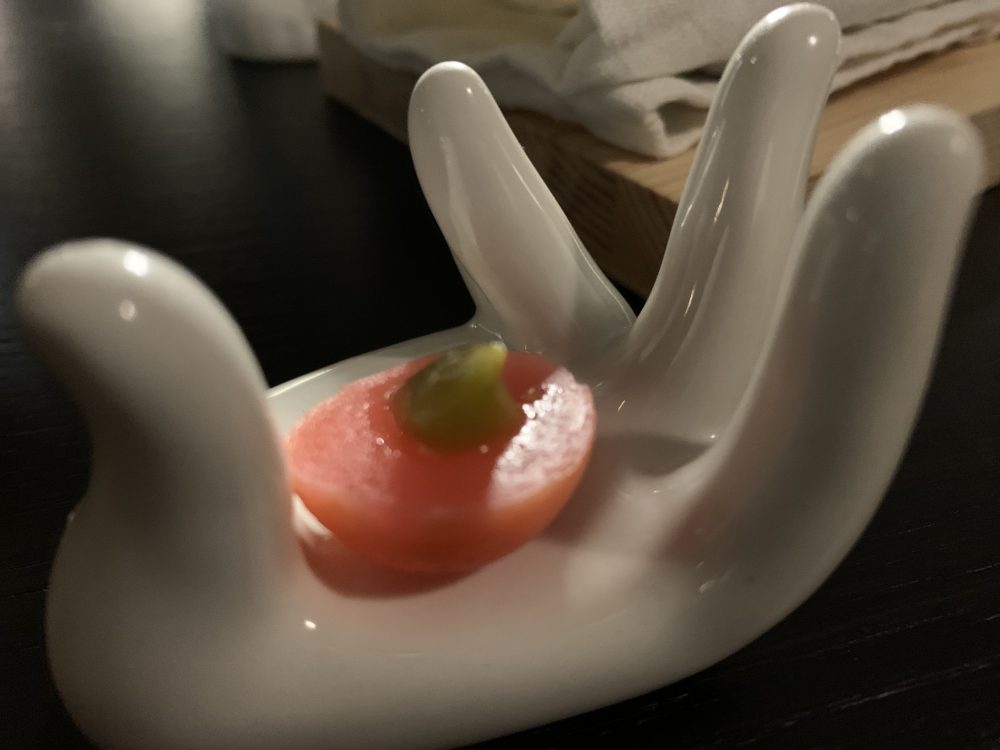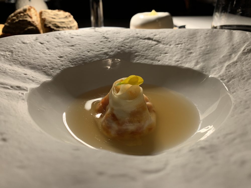 Vitium – Dumpling con pomodorino fermentato, caciocavallo, nocciola ed un Dashi balsamico allo zenzero