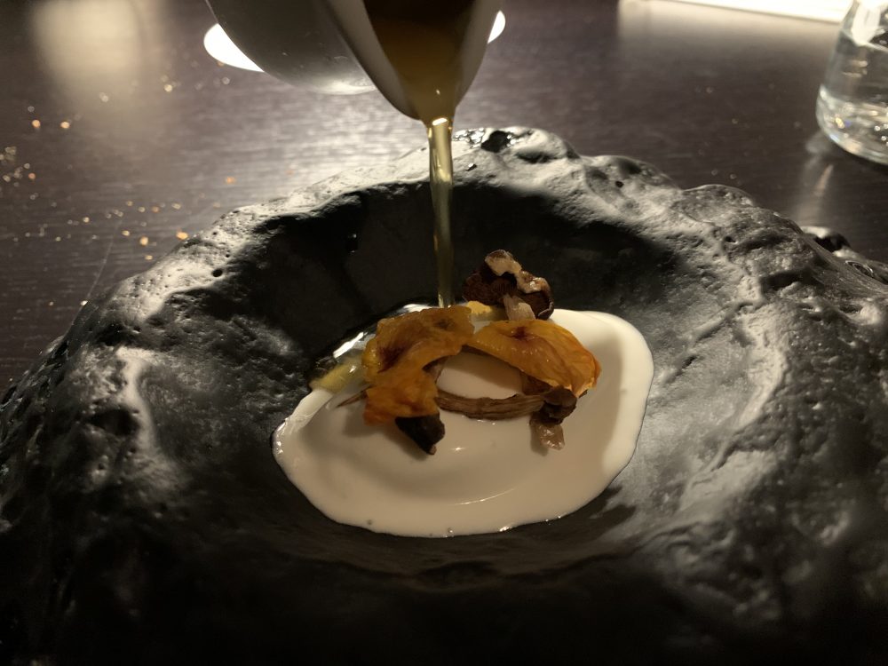 Per concludere con un gelato al fior di latte, con dei flakes di funghi pioppini, lo sciroppo ai fiori di sambuco e il pepe bianco.