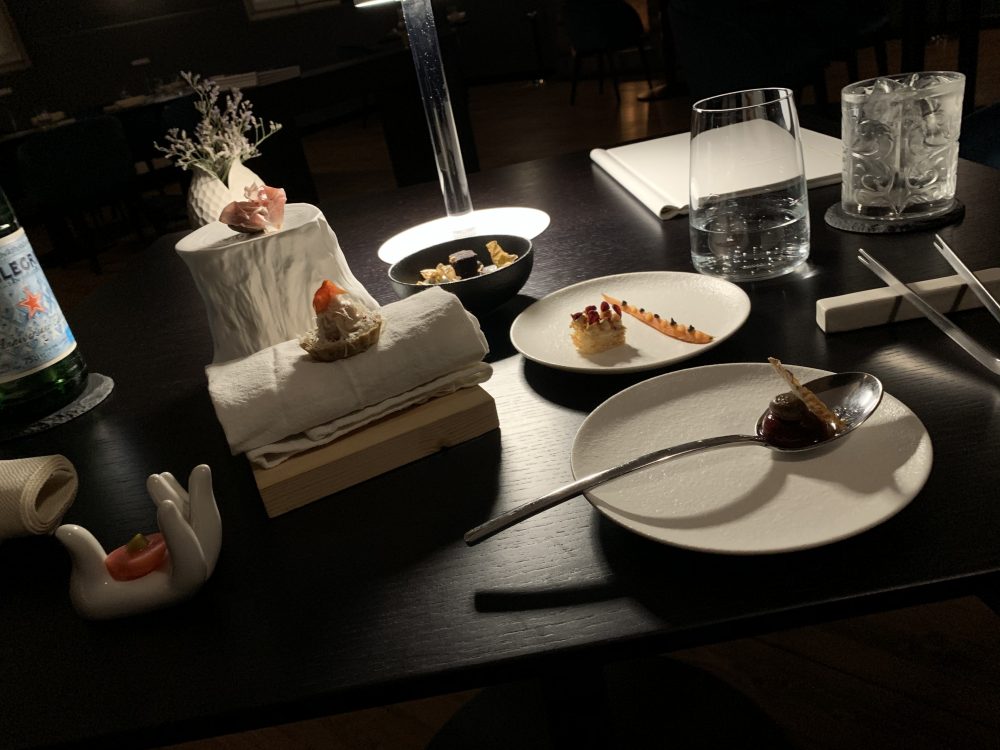 La cucina di Michele Minchillo è divertente, centrata, gustosa, ricercata, una cucina di contaminazioni sicuramente saporita. Sin dall’inizio del percorso un’altalena tra acido e amaro, con un richiamo alle affumicature, in quello che diventa un puzzle di piatti sapientemente posizionati sulla tavola in un viaggio di sola andata da seguire dietro indicazione di Federica. Ci si diverte già dagli starter. Tartelletta ai cereali chutney di pomodoro; paté di faraona, rafano, toast di nocciole, burro mantecato alla soia, polvere di peperone arrostito; airbag di grano arso con capocollo di Martina Franca; bombetta al Salva Cremasco dop ricoperta di riso nero; gel di rapa rossa oliva candita e chips di rapa bianca; ravanello acido e composta al friggitiello per concludere con una carotina fermentata, sesamo nero e gel di limone.