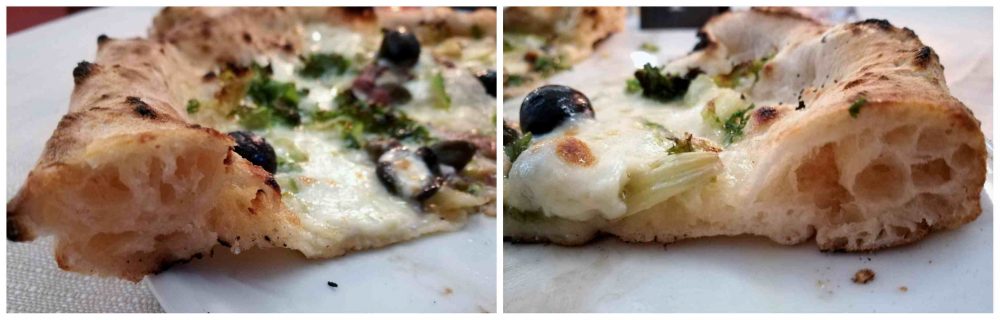 I cornicioni non sono ampi ma sono pur sempre pieni d’aria e con una bella alveolatura che lascia intendere il lungo processo di lievitazione che dona gusto e leggerezza all’impasto.