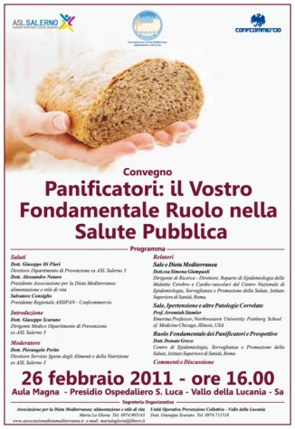 Così mentre alle 13.30 del 26 febbraio 2011 si chiudeva il programma ufficiale promosso da Comune di Pollica, Parco Nazionale del Cilento e del Vallo di Diano, Provincia di Salerno e Ministero dell’Agricoltura, alle 16 dello stesso giorno l’ASL Salerno, l’Associazione Dieta Mediterranea e la Confcommercio davano vita ad un convegno di grande levatura: Panificatori, il vostro fondamentale ruolo nella salute pubblica.
