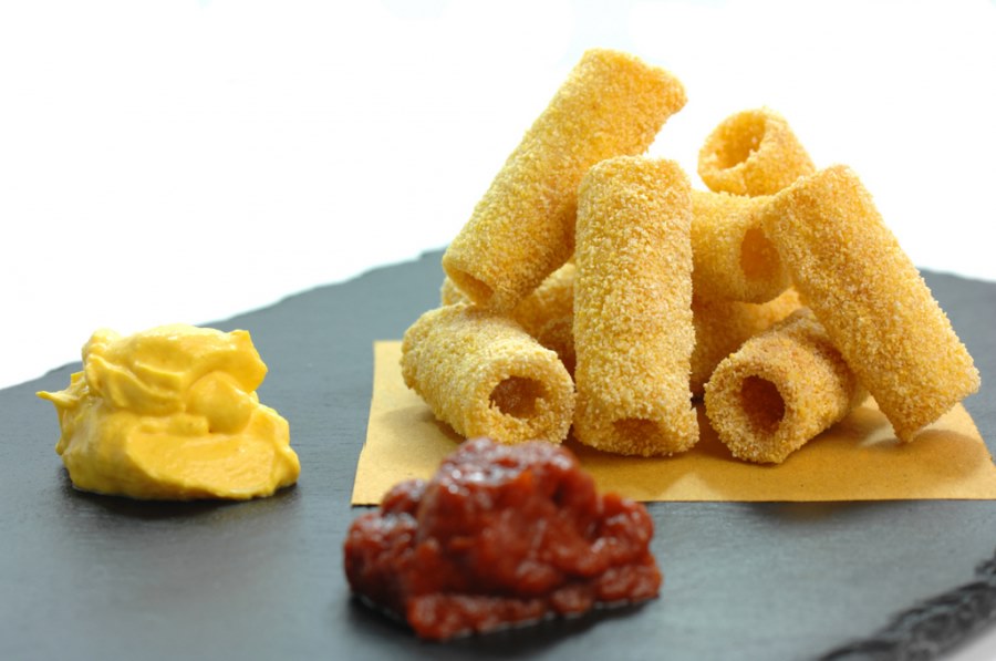 … Ovvero, “Candele di Gragnano in panatura di mais, con ketchup all’arrabbiata e finta maionese di ricotta bufala e zafferano”.