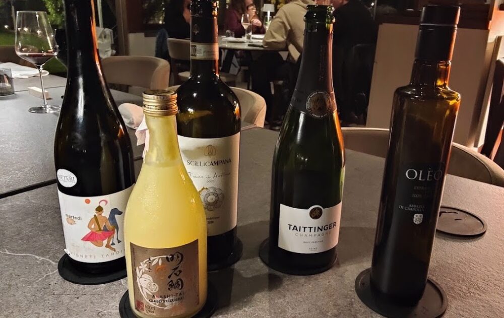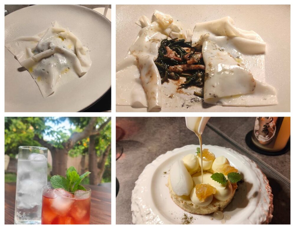 Secondo atto con Filetto di rana pescatrice in pelle di pollo, lumache di mare, taccole, fagiolini, terzo atto: Tortello di pasta all’uovo fatta a mano ripieno di coda di bovino brasata, jus di manzo, carote fermentate e salsa di carote e zenzero. Quarto atto: Biancofiore – Torta paradiso, namelaka al limoncello, composta di limoni salati, crema inglese al latte affumicato, sorbetto limone.