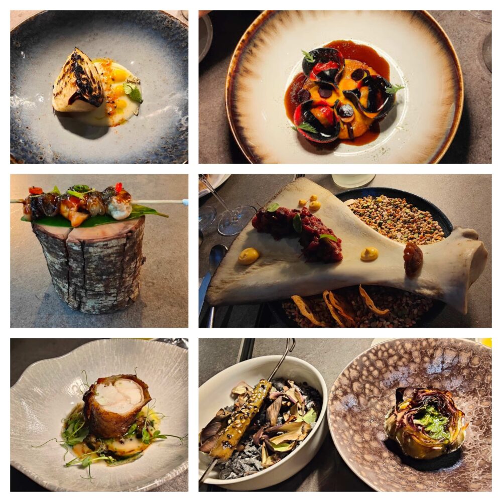 Il menu è diviso in atti, abbiamo assaggiato come amouse bouche lo spiedo di cozze e lardo alla griglia peperoncino candito. Poi primo atto: Carciofo alla brace, il suo brodo e gambo glassato al miso e sesamo; Calamaro: Tentacoli alla brace, velo di calamaro, agretti e lupini; Tartare di manzo, barbabietola alla brace, chimichurri, mayo al wasabi, chutney di datteri e chips di radici di loto; Finocchio alla brace, salsa della sua barba, arancia e sishimi.
