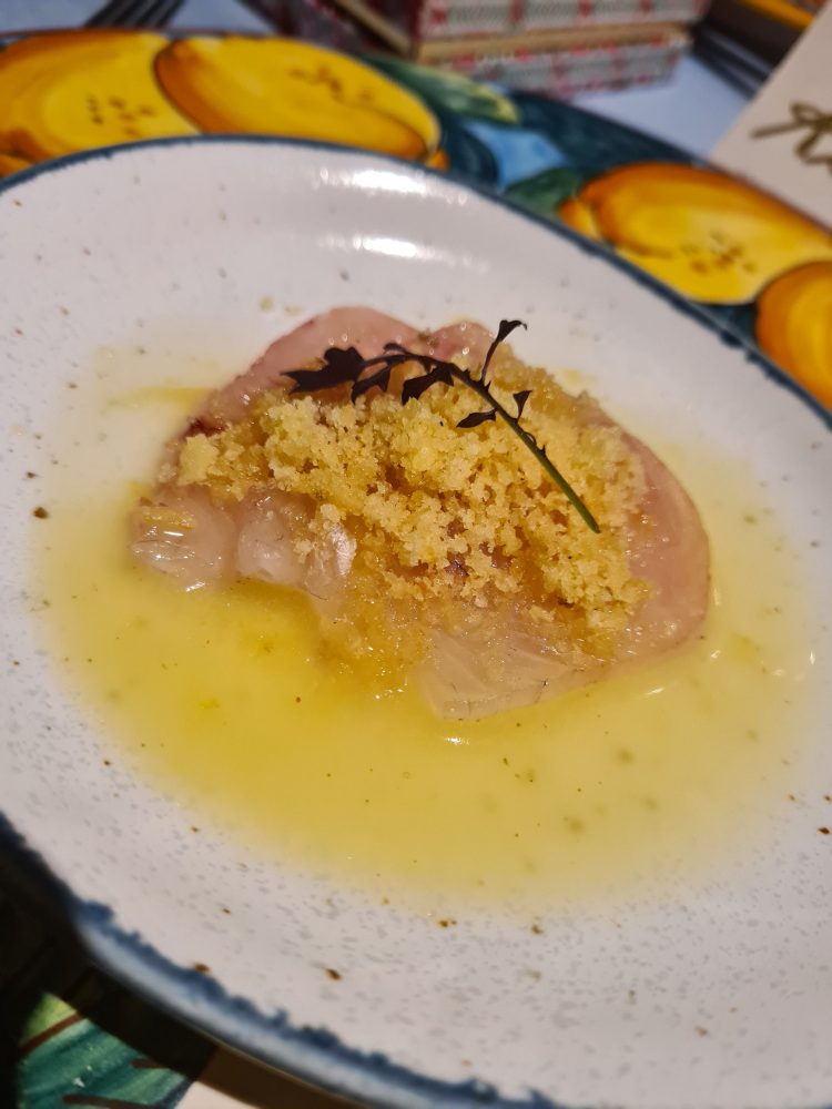 Lo start invece è con il crudo di ricciola, cosparso da una croccante panatura di lime e zenzero e contraddistinto da una piacevole nota per iniziare in freschezza.