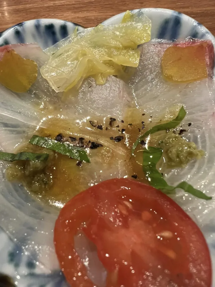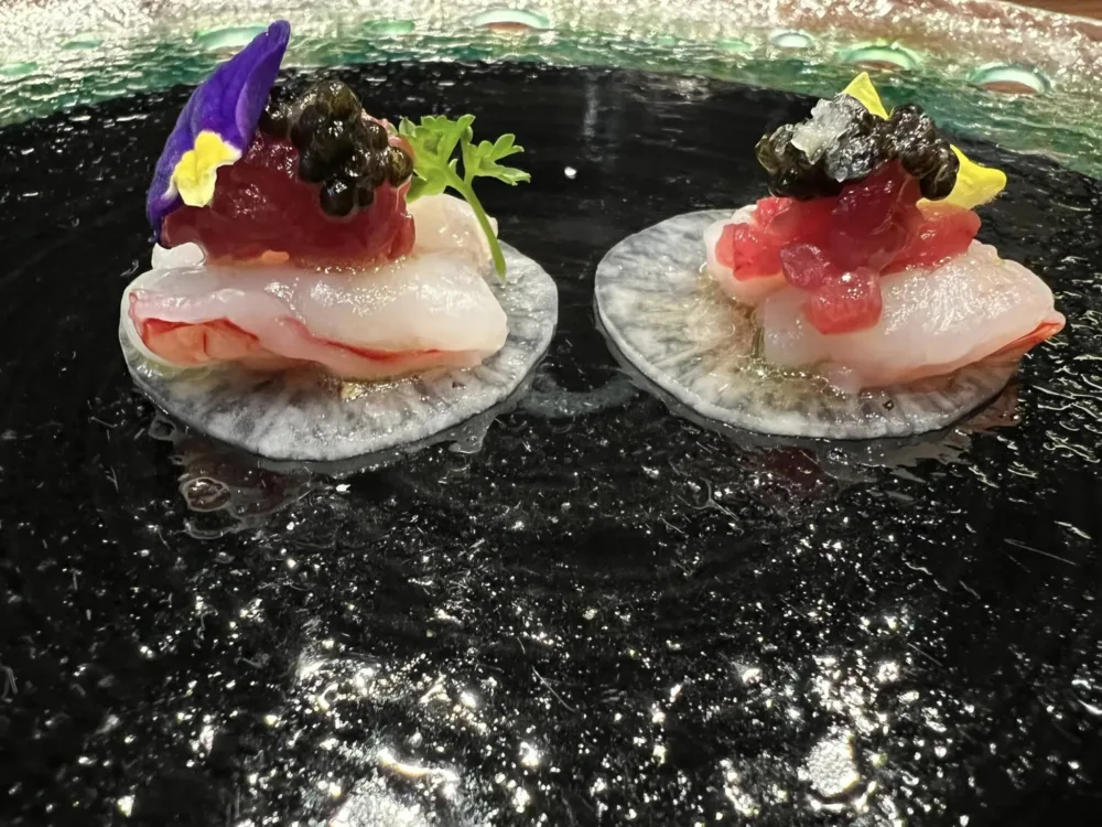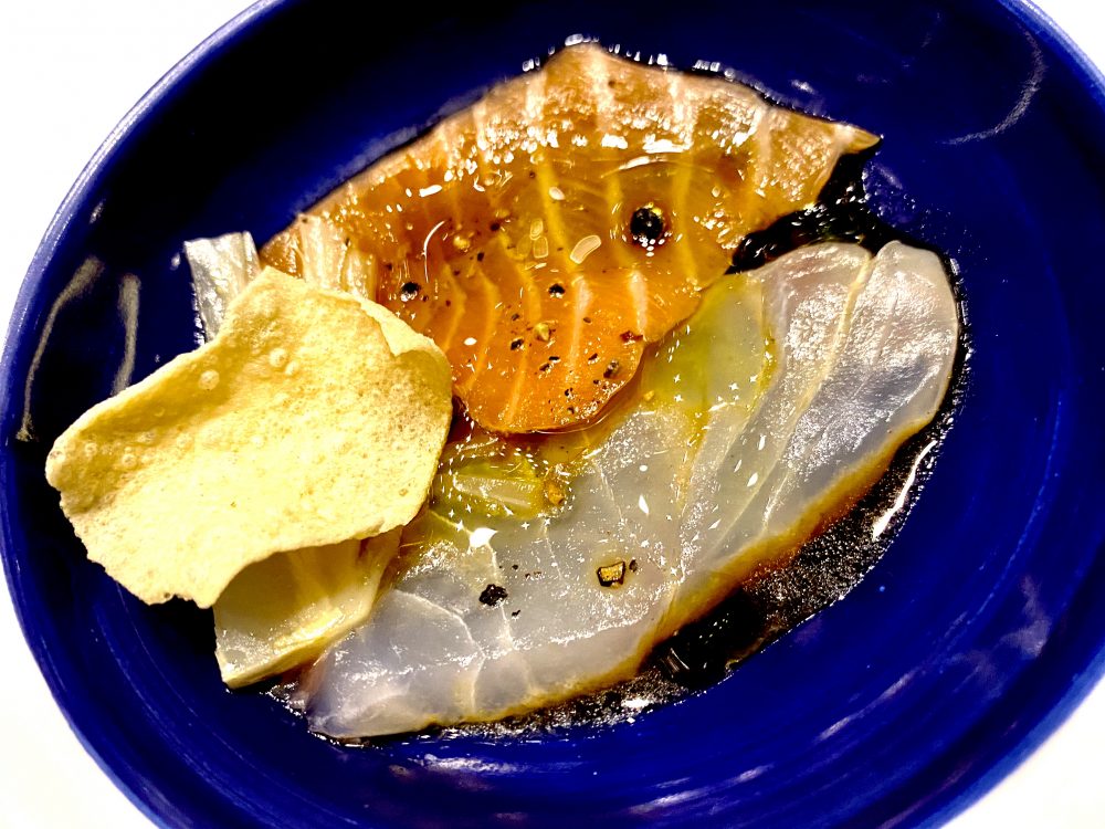 Carpaccio di Salmone Alaska e Ricciola Giapponese, Ponzu, Indivia Brasata e Cracker di Ceci