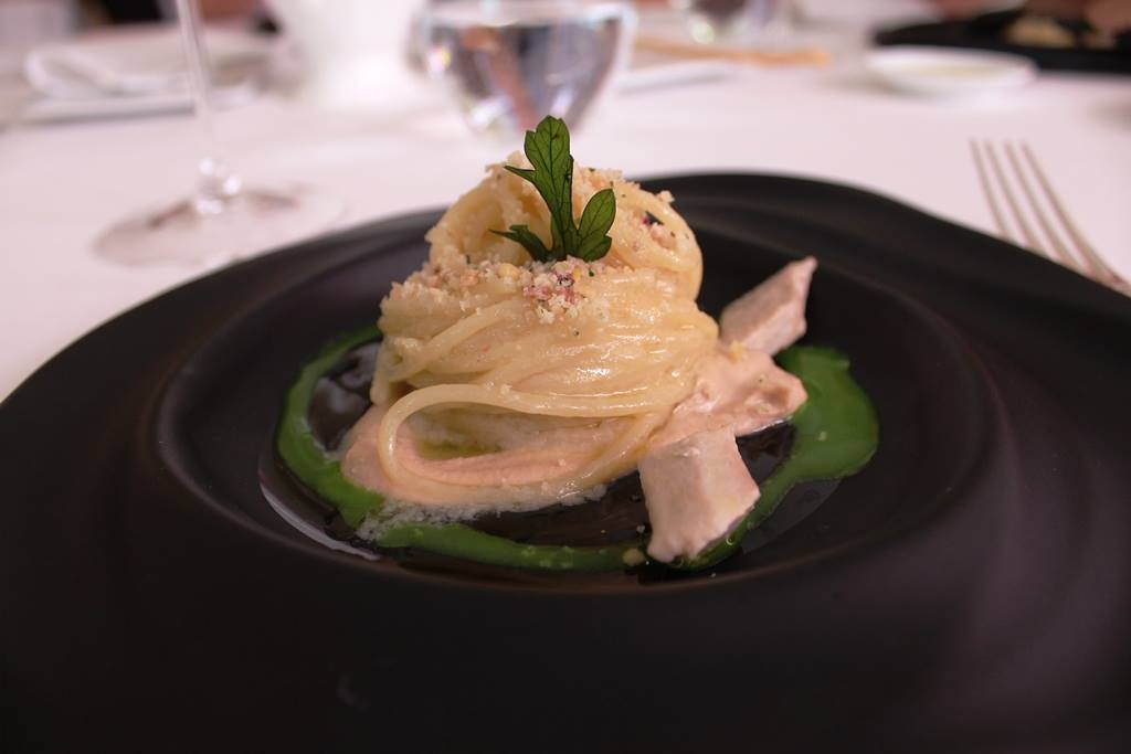 Ernesto Iaccarino, spaghetti con sgombro, pan grattato, pinoli e cipolla caramelllata con salsa di rapa e alalunga