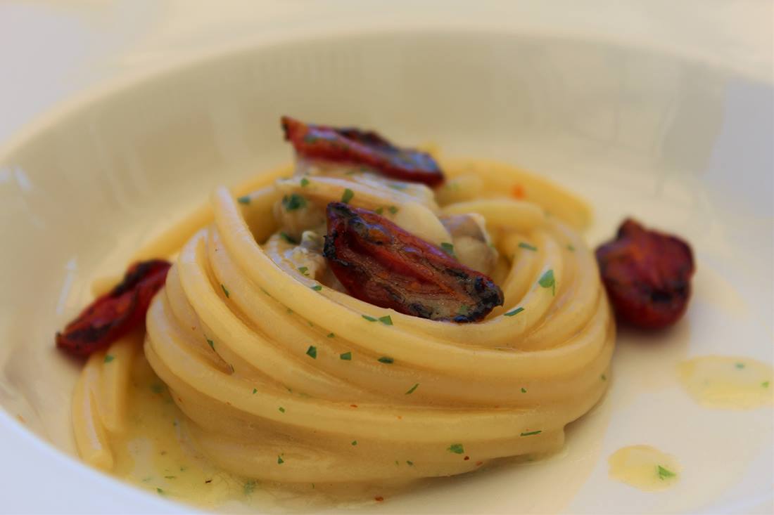 Mauro Uliassi, spaghetti affumicati con vongole e datterini alla griglia