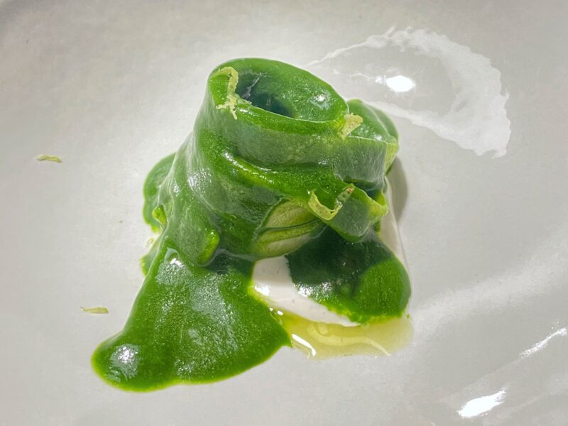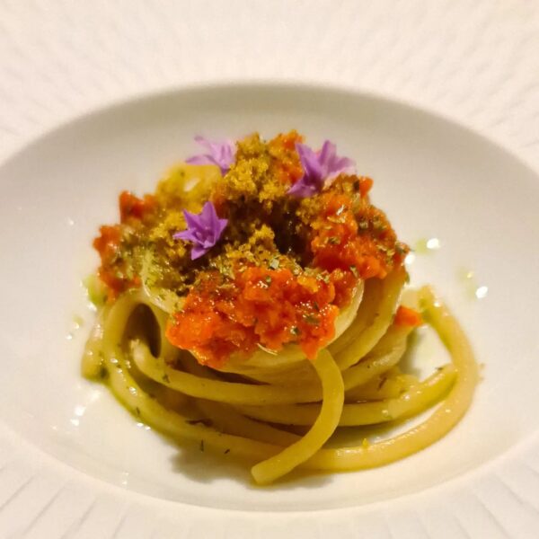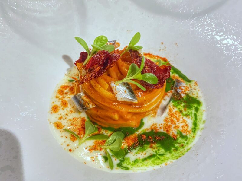Linguine in estratto di peperone, mozzarella, alici, portulaca. Il Faro di Capo d’Orso Andrea Aprea