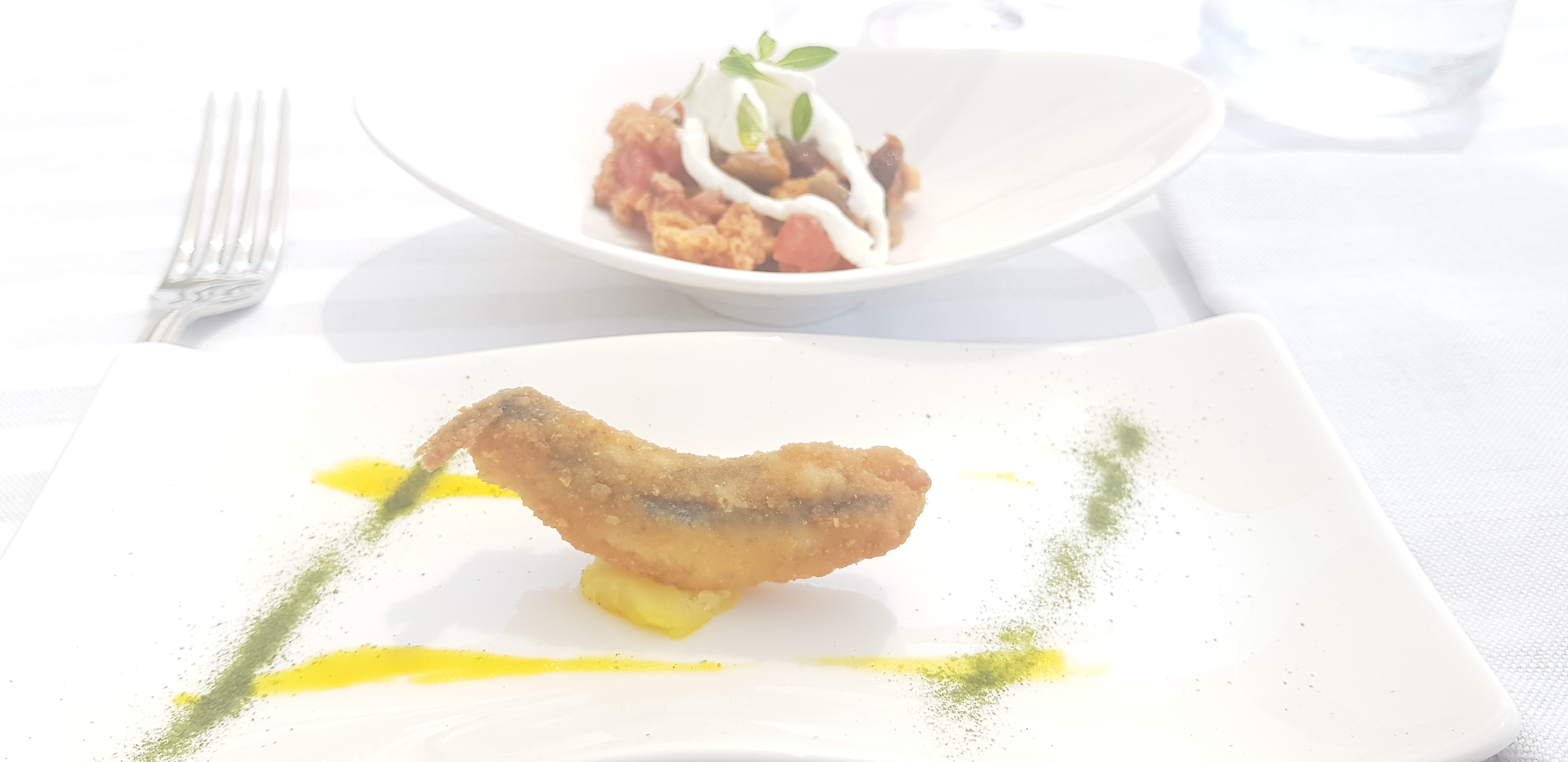 Stranamente ho conosciuto prima Mario Cinque, lo chef dello Yacht Club a Castellammare di Stabia, allora giovane ammiraglio ai comandi del capitano Peppe Guida. Solo un mese dopo approdai da Nonna Rosa a Vico Equense. Sembra passato molto più di un lustro, tante le cose successe in questi anni. L’allora giovane chef era talmente giovane che lo è ancora. Non gli mancano però oltre quindici anni di esperienza ai fornelli. Osservo oggi una grande evoluzione nella capacità di controllare la materia e il fuoco. Un pranzo estivo che è un giusto equilibrio tra gusto e leggerezza. Note fresche si innestano sui passaggi golosi dei bocconi di gamberi e calamari.
