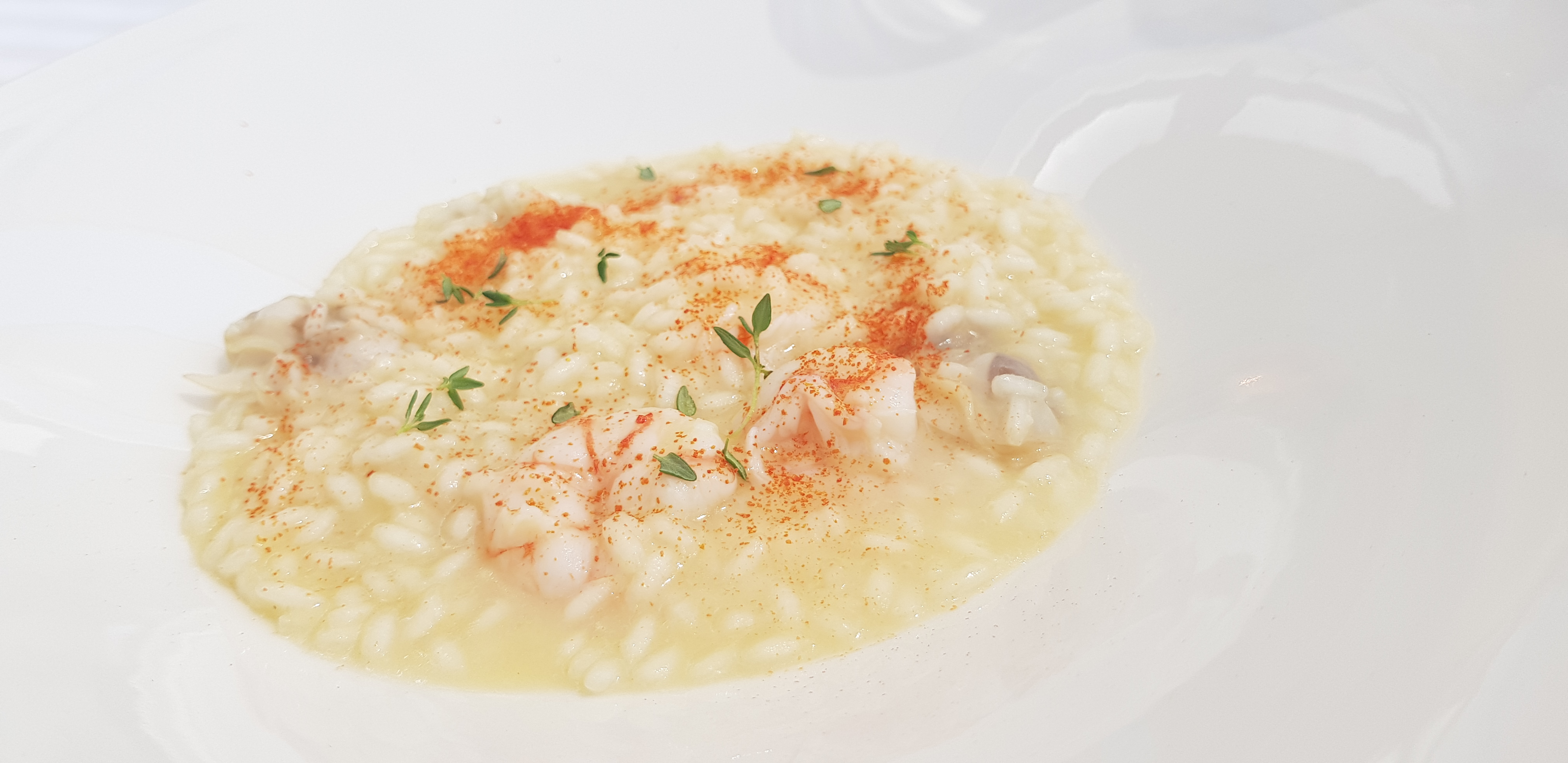 Il risotto all’acqua di pomodoro con tartufi e gamberi è un esempio di piatto che restituisce un gusto semplice e concentrato utilizzando la tecnica e la conoscenza degli ingredienti.