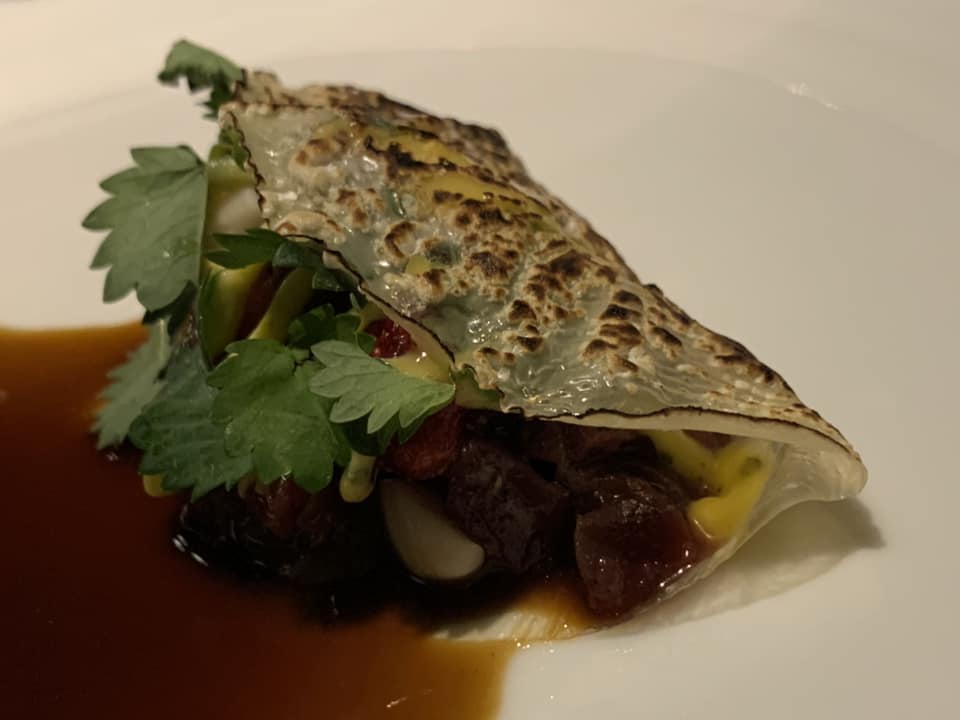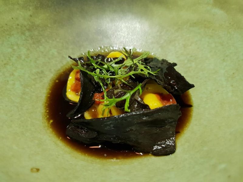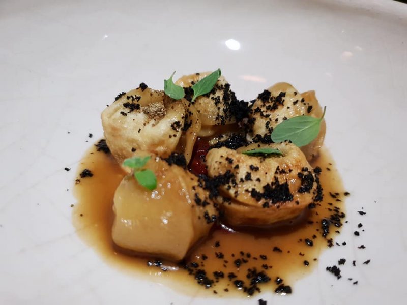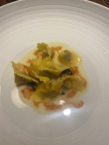 Panzerotto, farcito con del galletto affumicato, servito con polvere di capperi ed olive, alla base una salsa di pomodoro del piennolo. E’ uno dei due piatti del viaggio. La pasta è tesa alla perfezione, il ripieno è goloso e intenso, il brodo di pomodoro del piennolo, fornisce la giusta aromaticità e acidità. Molto ben fatto anche il tortello, funghi e ricci di mare. I tortelli vengono farciti con tre tipi di radici, scorzobianca, topinambur e rapa bianca, serviti con di ricci di mare trombette della morte ed un brodo di funghi che sa di umami.