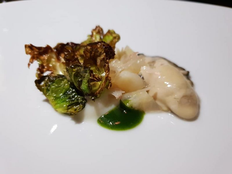 L’ostrica e nervetti, adagiata su una crema di cavolfiore, olio di verbena, insalata di nervetti, scalogno e dei cavoletti di Bruxelles fritti. La capasanta, scottata, servita con caviale, crema di porro bruciato e fritto, gelato di mandorla e crumble di mandorla bruciata. Tecnica e cotture espresse, anche se ci sarebbe piaciuto vedere il giovane cuoco anche alle prese con qualche prodotto meno pregiato, soprattutto nella prima parte del menù.