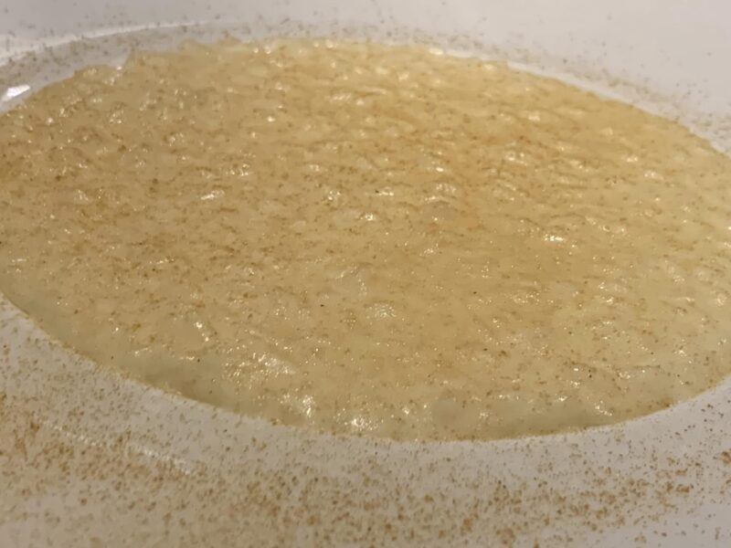 Un giro di formaggi e si chiude con il risolatte, caffè e cardamomo. La spezia riesce nell’intento di smorzare la dolcezza di un dessert relativamente semplice, che sa di colazioni dell’infanzia.