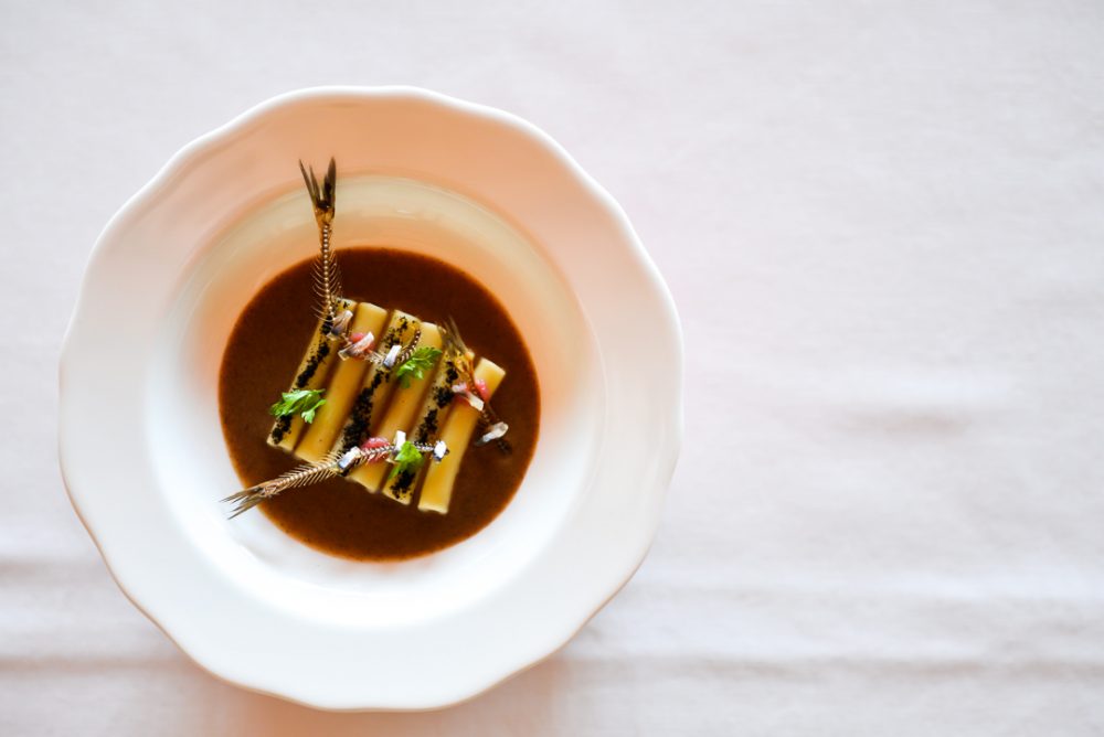 Andrea Bozzato, chef del Ristorante La Posa Degli Agri a Legnaro, partecipa al Primo Piatto dei Campi 2019, iniziativa siglata LSDM e Pastificio dei Campi, con Ziti Tagliati Lisci tra Veneto e Campania – Ziti cotti in acqua di mozzarella, vellutata di cipolle brasate, marmellata di cipolla rossa agrodolce, lisca di alice croccante, alice marinata, polvere di bucce, puntarelle.