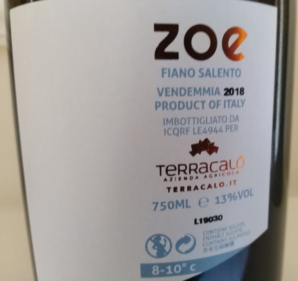 Controetichetta Zoe Fiano Salento 2018 Terracalo’