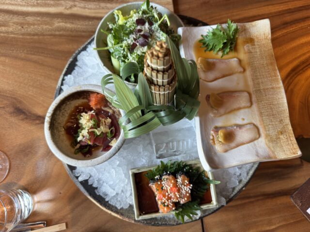 Il sake occupa un ruolo centrale, con una selezione di oltre 40 varietà, tra cui il raro Biwa no Chōju, prodotto esclusivamente per Zuma con le acque del lago Biwa.