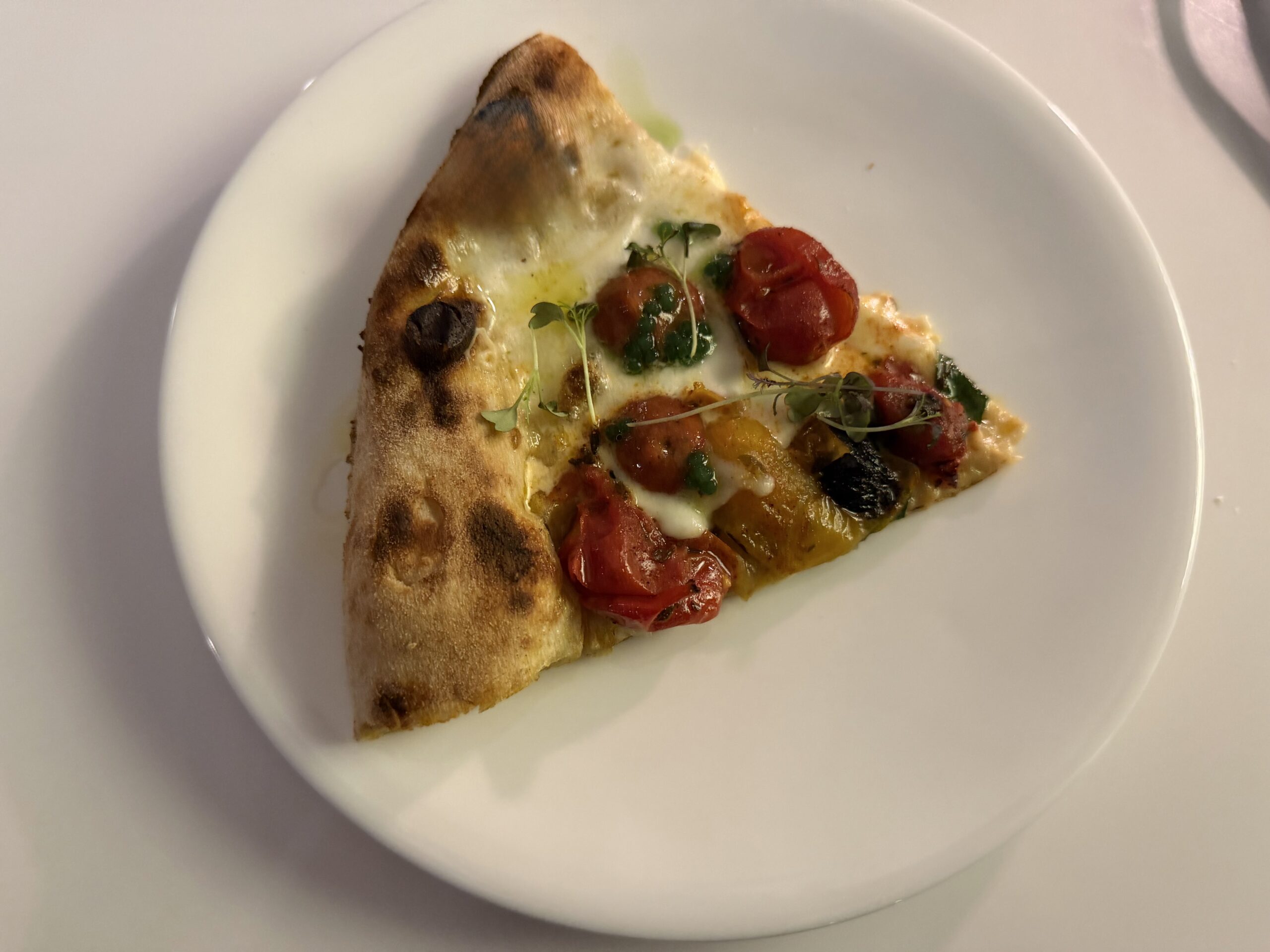 Margherita Bruciata: mozzarella di Gioia del Colle DOP Gioiella, pomodorini gialli e rossi bruciati, papikra dolce e perlacee di basilico – Brando Pizza Bistrot