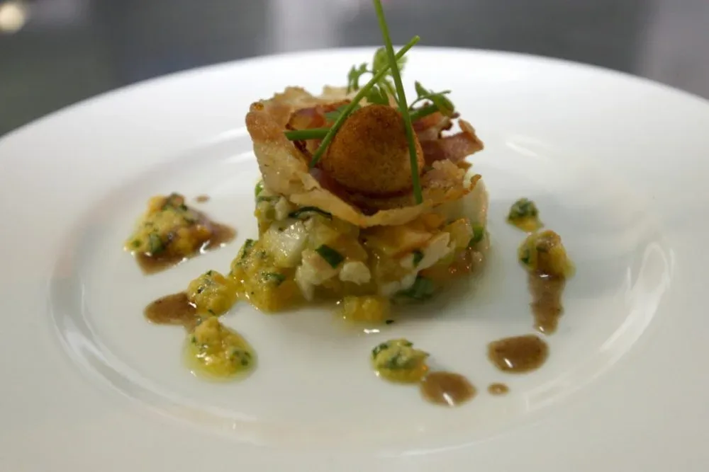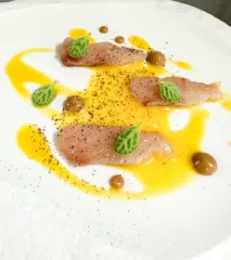 Carpaccio di ricciola, salsa al datterino giallo, cremoso di tamarindo e polvere di cipolla bruciata ricciola