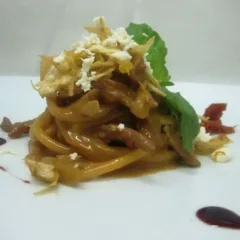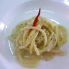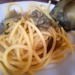 i primi Bucatini con ragù di agnello, carciofi fritti, pomodoro San Marzano secco, scaglie di caciotta cilentana e riduzione di aglianico 22 Gennaio 2014 3 commenti