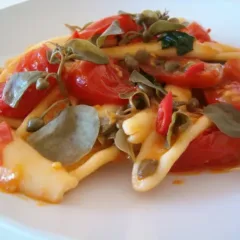 i primi, puttanesca Cavatelli freschi con pomodorini e capperi con le proprie foglie: lectio sulla puttanesca 20 Novembre 2013 3 commenti