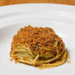 Primo Piatto dei Campi 2023, Bologna, Ricette no sprechi Spaghettini, capperi, limone e briciole di mare di Enrico Failla capperi, Limoni, Olio EVO, Parature di pesce, Pasta di Gragnano IGP